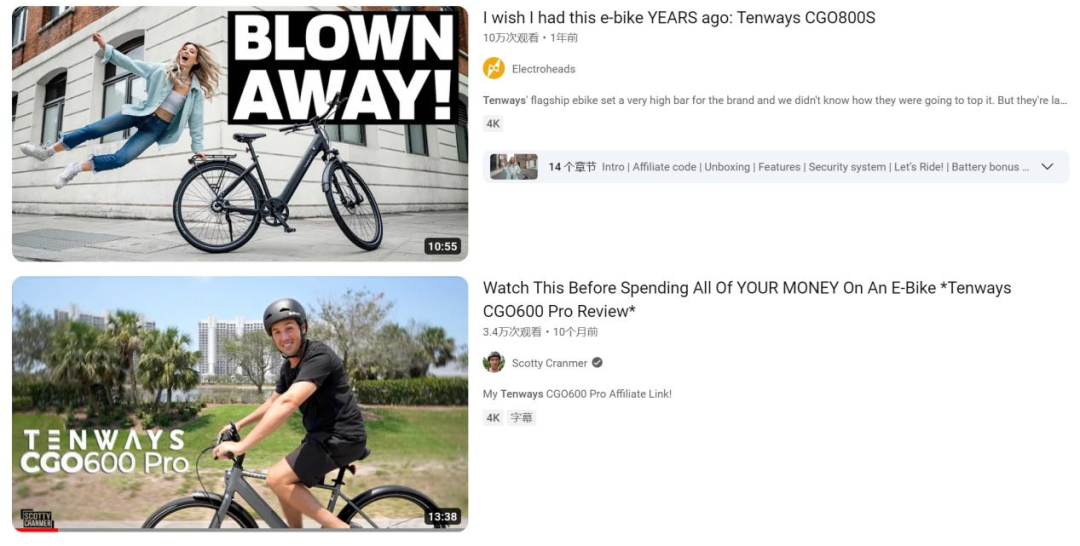 在YouTube上,TENWAYS邀请了户外运动的垂类博主,为其产品拍摄视频,精准覆盖E-bike爱好者。视频的内容主要以第一人称的骑行体验为主,尤其是户外骑行测评类。