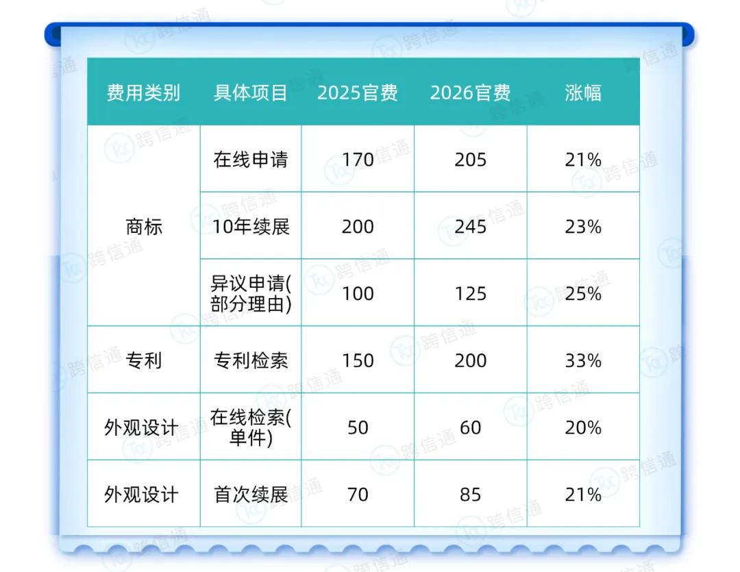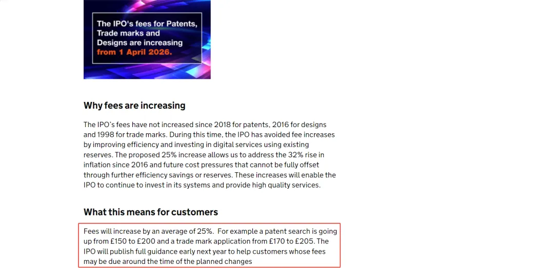 英国知识产权局(UK IPO)正式发布通知,自2026年4月1日起,专利、商标、外观设计等官方费用将全面上调,平均涨幅达25%左右。