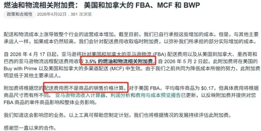 同一天,亚马逊美国站发布通知:自4月17日起,对使用FBA的卖家统一加收"燃油与通胀附加费"。地缘政治的冲击,这一次实实在在地落在了卖家的物流账单上。