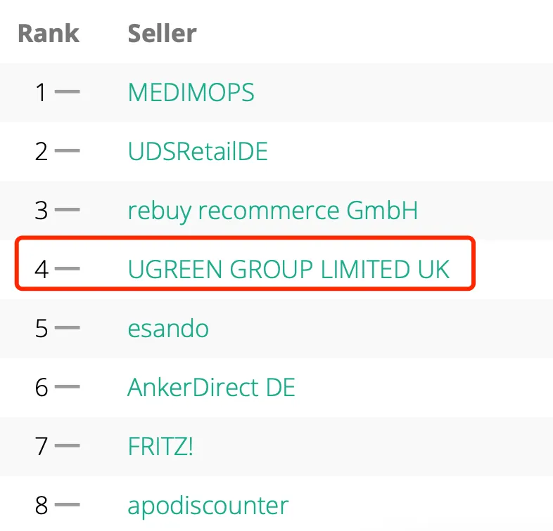 亚马逊欧洲生意最大的德国站,绿联店铺排名第4。