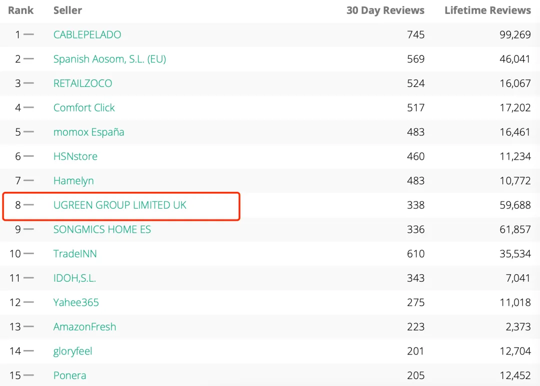 西班牙站,绿联排名第8。这4个大站,绿联均进入了前十名。