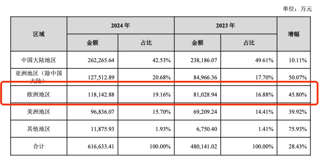 其中,来自欧洲地区的收入12.75亿元,同比增长45.80%。