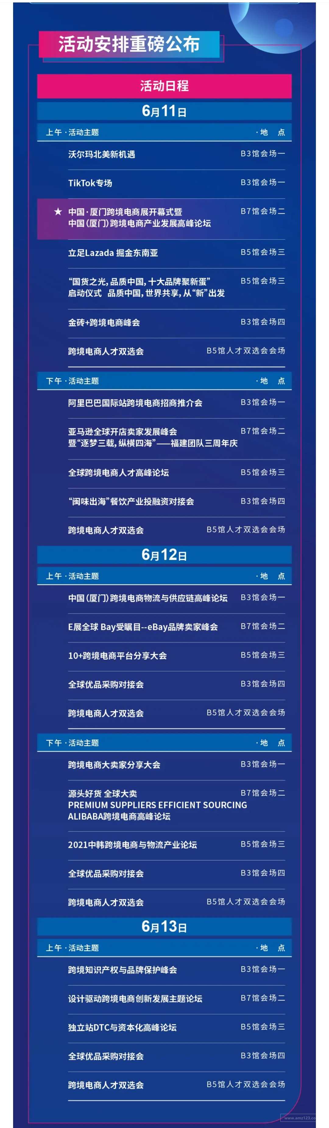 2021 年 06 月 11-13 日,在福建·厦门国际会展中心B3-B7馆,即将有一大批跨境人左手拿着小蓝杯,右手提着镭射袋,肩上扛着机械键盘和音响,兜里还藏着各种优惠券和卖家必修课程门票,满载而归。