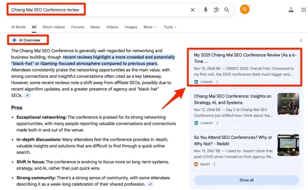Google 的 AI Overview(或去 AI Mode 问),一样也 cite 了我的这篇 LinkedIn 文章。