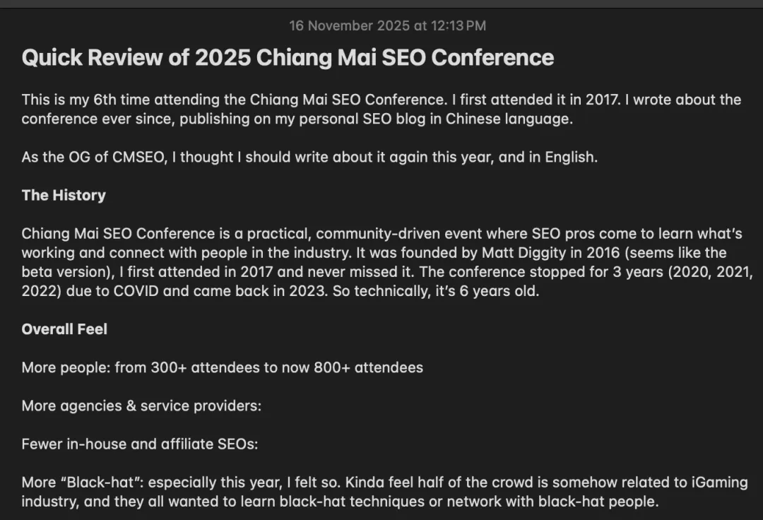 两周前,参加完清迈SEO大会后,我第一时间用英语撰写了一篇大会报道,并做了一个关键选择: