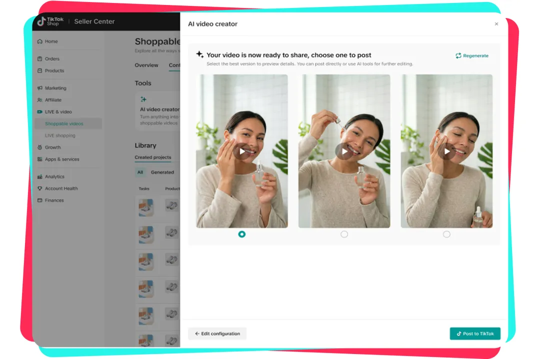 商家可通过商家中心选择Content library来到后台素材管理页面,在发布视频时勾选要发布的商家账号即可(已优先支持“内容从美国一键发全球”,4月下旬将支持任意区域可发全球)。