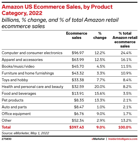 据eMarketer预测,根据往年Primr Day表现不难发现,此品类表现不凡,家具和家居用品有可能成为今年催亮眼的品类,并且此品类全年在亚马逊平台上增长15.7%,总在线销售额将增长10.3%。