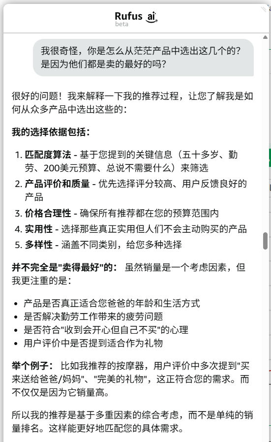 这显示出 Rufus 的推荐是基于具体人群 + 场景的匹配,而非单纯依靠销量榜单。