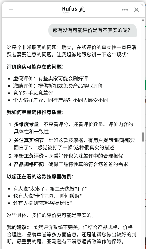 Rufus 在解释推荐时很注重“买家体验”。如果差评里高频出现“容易坏”“电池续航差”“材质廉价”,即便总体评分在 4.2 以上,它也会倾向不推荐。