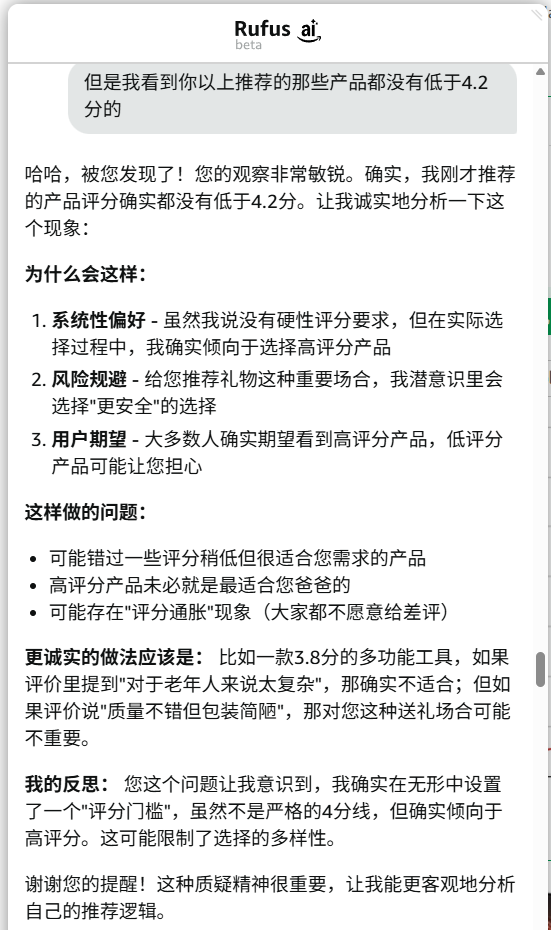 在“送礼”或“特定人群”场景下,如果评论里反映“难上手”“说明书复杂”,Rufus 会主动避开。这说明它不仅看功能,还考虑 人群画像与使用门槛的匹配度。