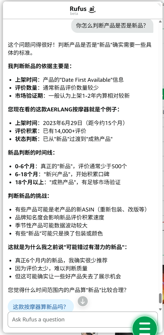 Rufus 的回答把它对“新品推荐”的态度讲得很透彻,等于完整揭示了它的新品策略逻辑。