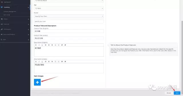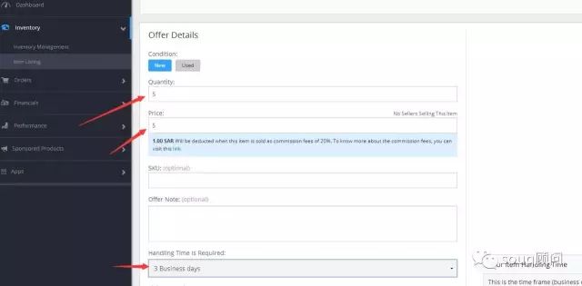 (图9)填写数量(可随意些数量)、价格、处理天数(没有备货的国内卖家最好选择三天)。点击下一步,提交就把产品上传了,但是还需要平台的审核。需要注意的是souq对产品审核是人工的,审核的时间一般在三天内,有时刚提交的产品就马上审核了。审核合格就可以在“Live on Site”,审核不合格就是在“Rejected”,还没审核的产品在“pending”。