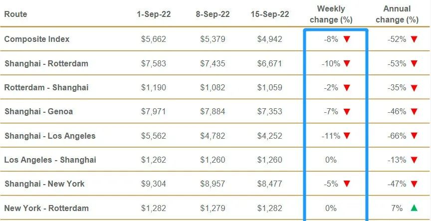 SCFI最新一期(9.16)主要航线运价继续全数走跌: