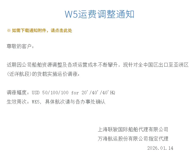 因公司船舶资源调整及各项运营成本不断攀升,针对全中国区出口至亚洲区(近洋航段)的货载实施运价调涨,2026年1月26日生效,调涨幅度为: