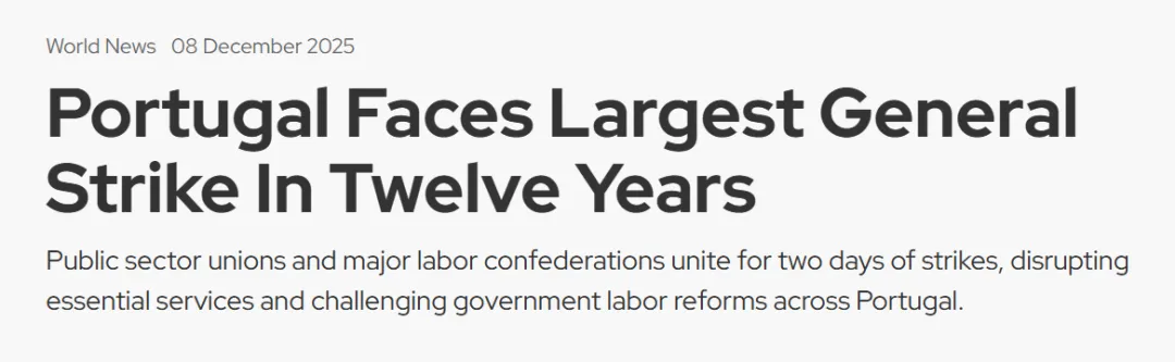 葡萄牙也将于12月11日迎来12年来首次全国总罢工。