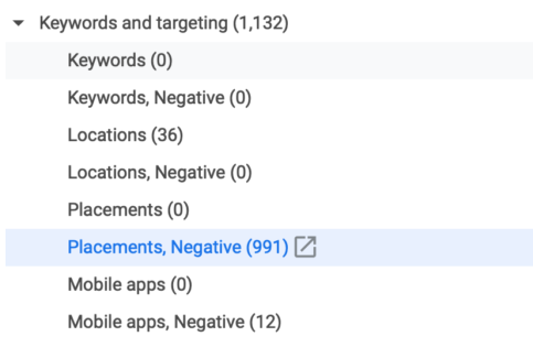 Google Ads Editor中的排除项,如果你有更多的排除对象,则可以更轻松地将其批量上传到Google Ads Editor中,你需要将网址、移动应用和YouTube排除项分开,因为它们是编辑器中单独的排除项类型,对于网址,你可以在Keywords & Targeting>Placements,Negative下执行此操作.