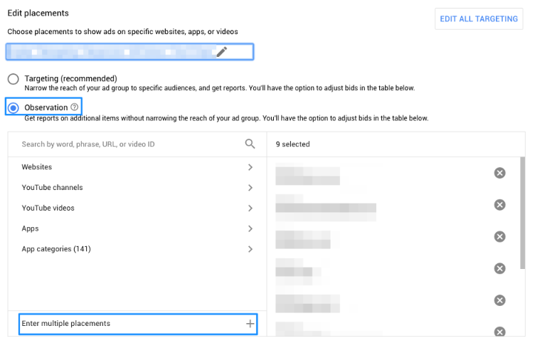 与否定关键字列表类似,此功能可让你在一个列表中添加所有URL,移动应用或YouTube排除对象,并将其应用于多个广告系列,如果一个广告系列中的YouTube频道或视频效果不佳,则应避免其他广告系列包含此展示位置。