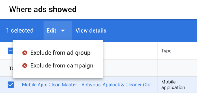 2、添加展示位置排除对象,在查看了广告的显示位置之后,你可以通过两种方法排除效果不佳的展示位置,界面中的排除选项,当使用少量排除选项时,你可以在界面中快速找到这些排除项,只需点击展示位置,然后选择“Exclude from ad group”或“Exclude from campaign”。
