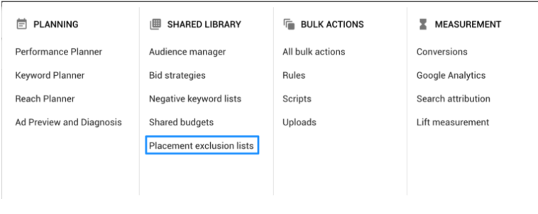 这是删除整个帐户中效果欠佳的展示位置(例如YouTube儿童频道)比较有效的方法,可以在Tools & Settings> Shared Library下找到并创建展示位置排除列表。
