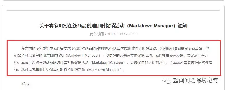 我经常有句口头禅,做eBay平台,如果不时时刻刻的关注eBay政策的变化,绝对是对eBay流量红利的机会浪费,对自己GMV的不负责!从US站点同步欧洲澳洲打折活动Markdown到14个工作日不能有价格变化(包括参加其它promotion)仅仅2个月,卖家的不适应又让eBay做出了改变!