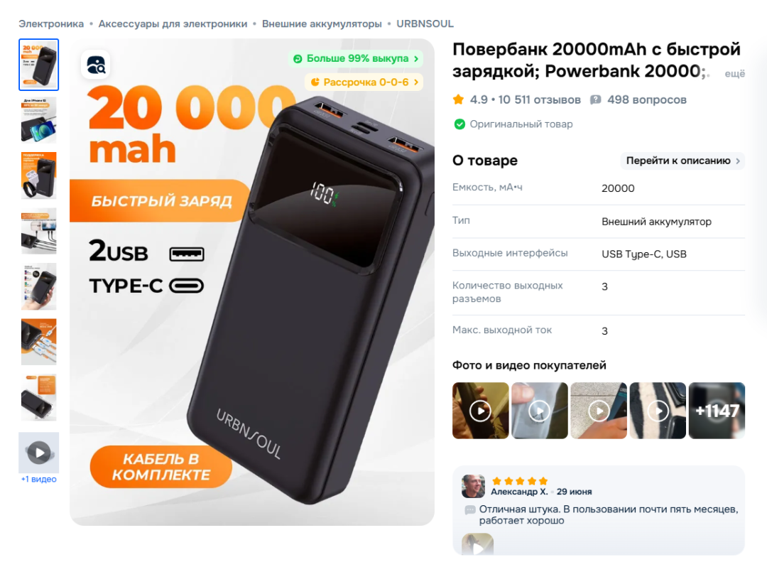 大字标注核心参数:20000mAh、БЫСТРЫЙ ЗАРЯД 快充