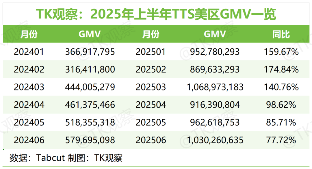 1、TikTokShop美区上半年整体规模约58亿,同比增长116%,3月和6月单月GMV超10亿$,关税导致4月份出现较大下滑,目前TTS美区复苏增长。