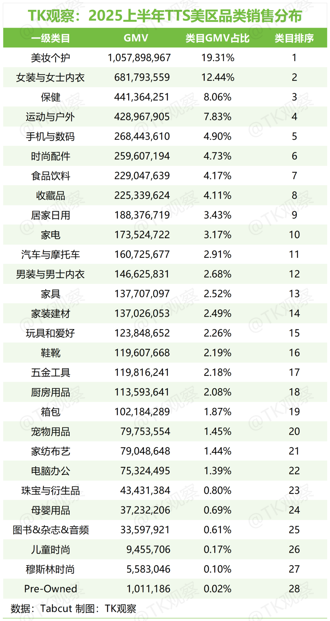 二、除了了解TTS-US大盘数据外,什么品类好卖,做什么品类机会大竞争小,我们先看2025上半年TTS-US的品类销售分布数据: