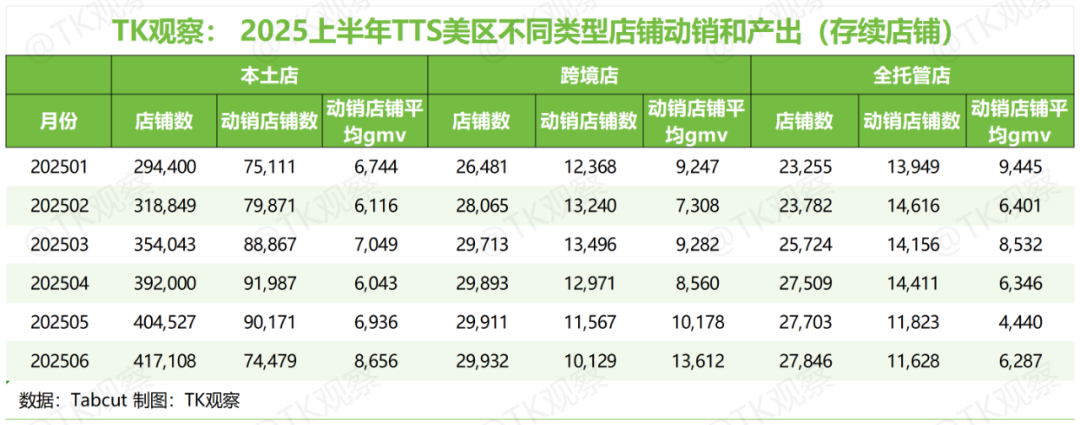 剔除闭店数据,我们仅分析存续店铺看,美区TikTok截至6月底的总店铺数量有47万家,对比去年同期增加了14万家。2025年上半年TTS-US本土店、跨境店、全托管店,三类型存续店铺的动销店铺率分别是17.8%、33.8%、41.7%。