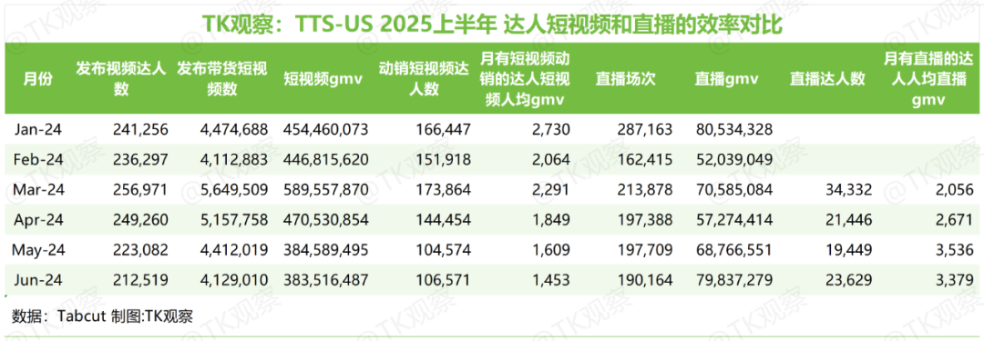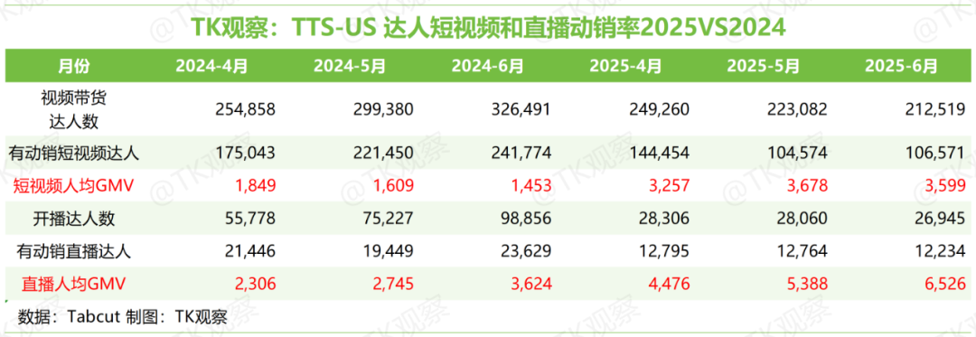 数据显示,2025上半年,TTS美区短视频有动销的人均GMV从2730$逐步提升到了3599$,而TTS美区直播有动销的人均GMV从3803$提升到了6526$。也就是从都能带出货的角度看,TTS美区达人短视频和直播的人效均有所提升!直播达人的人效提升更加明显!