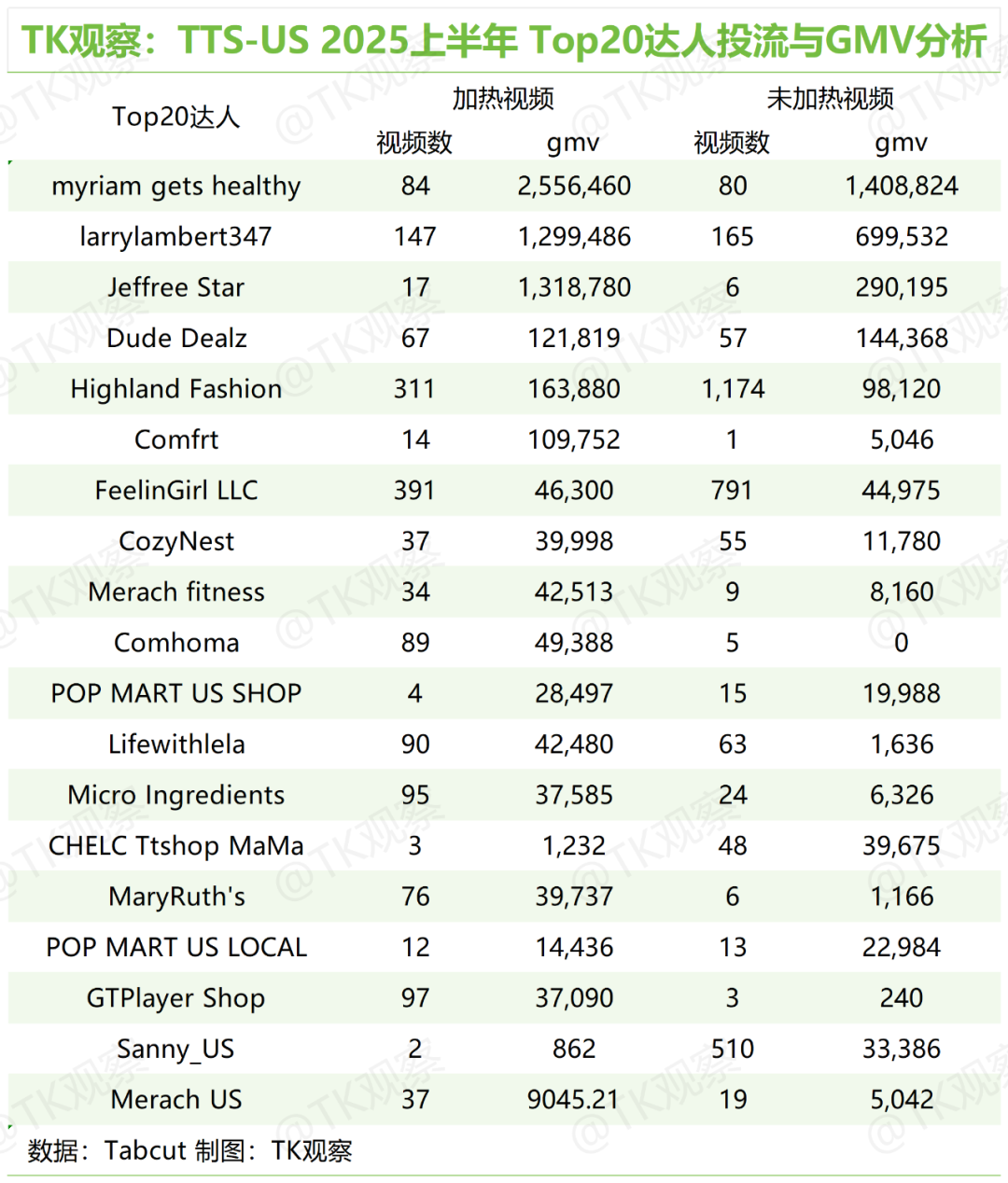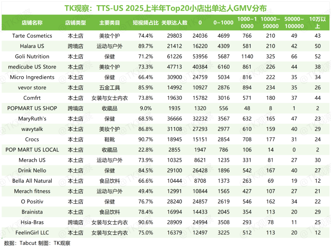 七、经营TTS美区市场的朋友都知道,找外部的达人制作短视频内容是最主要的动作,没有之一,毕竟现在美区短视频还有半壁江山,那么头部的卖家是怎么做的呢?我们分析了TTS美区上半年前20的小店,得到了如下的数据: