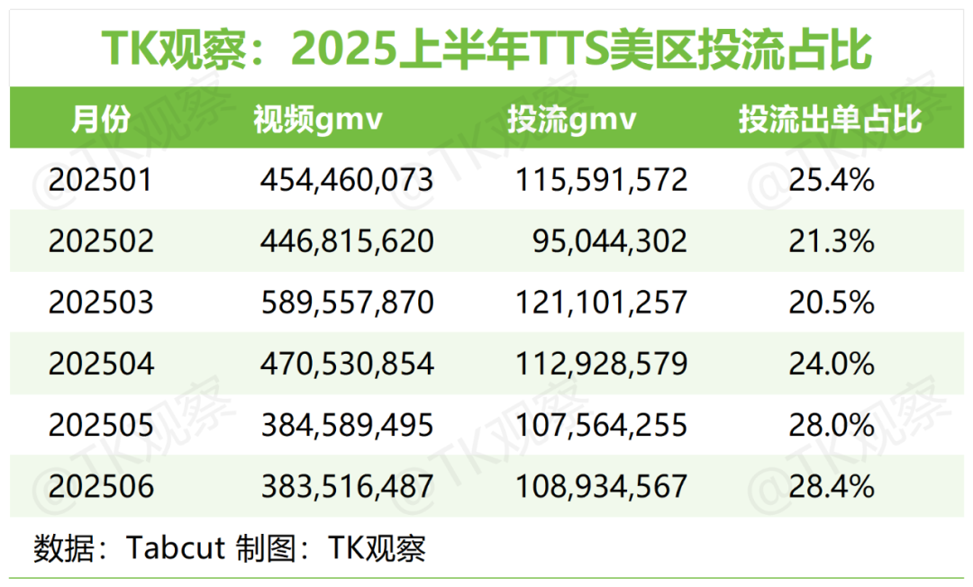 从以上数据我们得知,目前TTS-US的投流成交占比约24.6%,投流短视频数量约24%,短视频投流数量的占比由2025年的1月份的16%提升到了6月份的29.8%,近3成的TTS短视频现在都在投流!