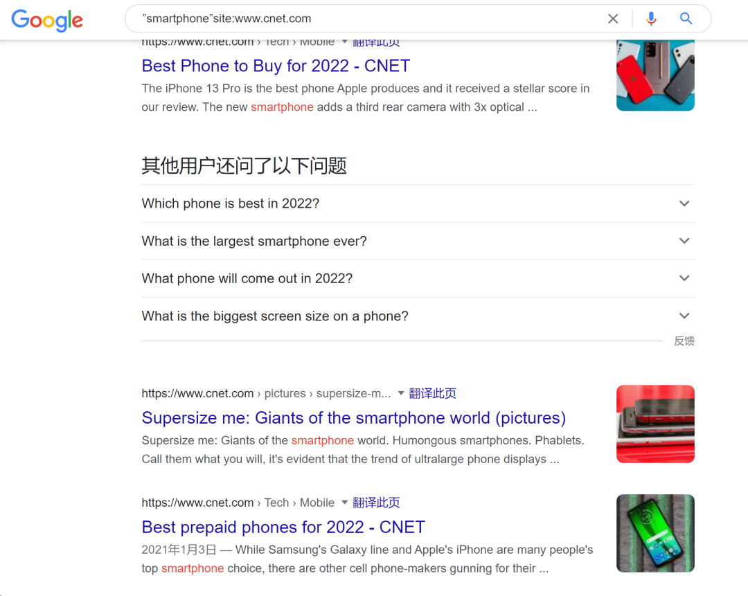 例如:在谷歌搜索框中输入”smartphone”site:www.cnet.com,按回车。