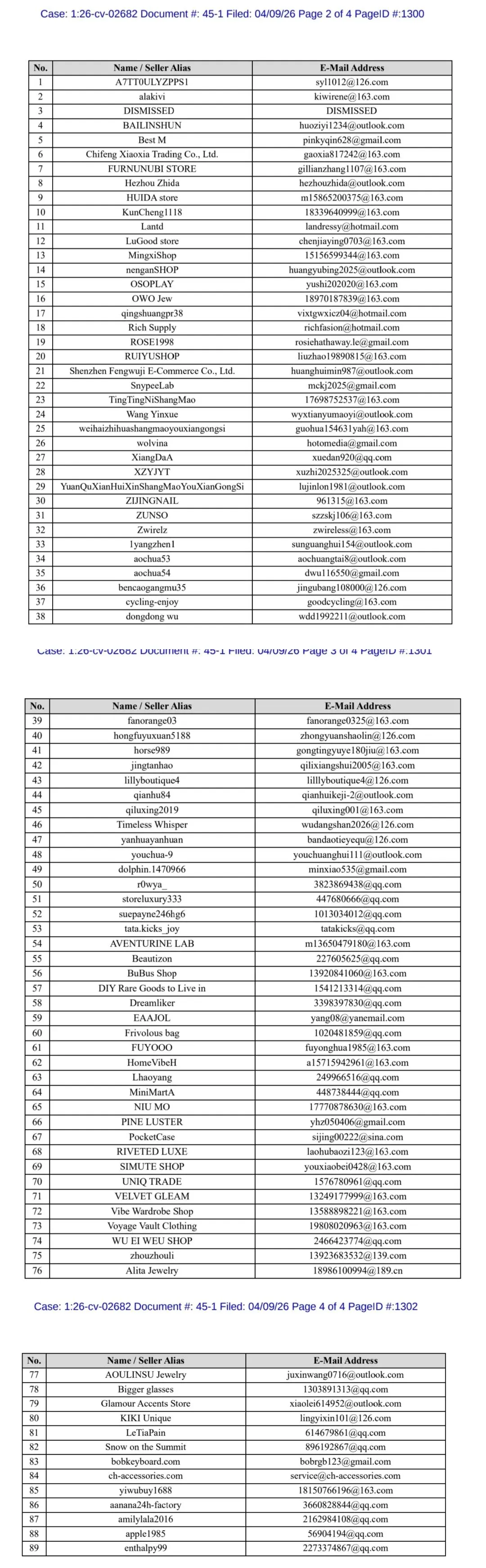 26-cv-02682于2026-03-10立案,共起诉88家跨境店铺,以亚马逊、eBay等主流平台为主,名单截图如下,如已被告,建议及时处理,避免缺席判决而遭受更大的货款损失。