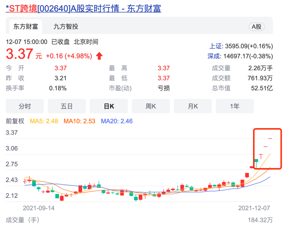 在此期间,ST跨境的股票价格接连两次发生大幅飙升。11月29日-12月1日,收盘价格累计偏离14.32%,12月2日、12月3日、12月6日,收 盘价格涨幅累计偏离14.32%,根据深圳证券交易所相关规定,都属于股票交易异常波动的情况。