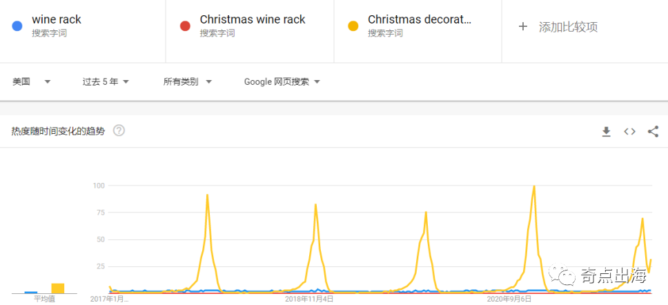 在谷歌趋势及卖家精灵上面搜索关键词,普通装饰品酒架是不具有季节性的,但圣诞系列的装饰品酒架是非常具有季节性的,通常在10月-12月,销量及搜索量都会大幅上涨。