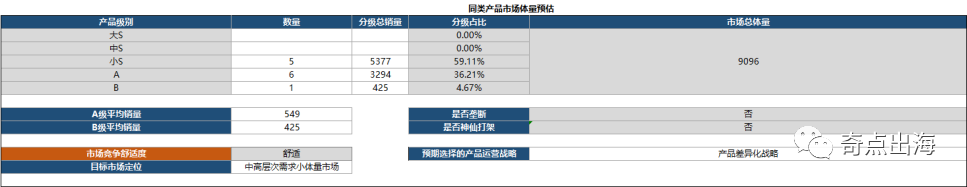 阿木对这类产品进行了调研,目前该类产品在美国站每月的总体量为9096,其中小S占5个,分级总销量占了5377,A级和B级分别是6个和1个;从数据上看,目前这类产品头部卖家虽然占据了大部分市场体量,但是各头部卖家的实力差距并不大,竞品数量较少,市场竞争环境也还算舒适。