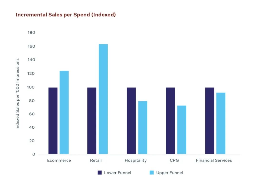 Facebook 在《品牌信息在带动销量提升方面的成效》完整报告(目前只有英文版,需要下载请关注公众号并回复【品牌信息】获取)中进行了深入研究,探索了垂直领域特有的更多研究结果,并为那些希望自己分析的商家提供了营销组合模型建议。“营销策划是否周全并最终成功,这都扎根在全面的成效衡量之上。只有做好成效衡量,才能以数据为导向,为短期和长期目标做出明智的决定。”——– Glen Mitas,Analytic Partners 高级顾问“对于营销而言,不存在灵丹妙药,重要的是掌握全局,摒弃非此即彼的片面思维。”——– Mike Menkes,Analytic Partners 高级副总裁“GroupM 和 Analytic Partner 的研究结果证明了上层漏斗的价值,不仅可以提升目前的销量,还能打造品牌的未来。”——– Ali Ladak,Facebook 营销科学主管“GroupM 的基准分析指出,同时运用上层和下层漏斗策略的品牌,其营销成效是只注重下层漏斗的品牌的两到三倍。”—— Anthony Miyake,GroupM 首席经济学家与只有下层漏斗策略才能达成短期目标这一假设相反,MMM 分析发现,在 Facebook 平台上,品牌营销和效果类营销都能有效持续提升销量。总体而言,效果类营销往往比品牌营销更能带动销量,这并不奇怪,因为上层漏斗营销锁定的是远未达到转化资格的消费者,而下层漏斗营销锁定的是购买几率较高的消费者。不过,品牌营销的单次展示费用通常要比效果类营销低,因为上层漏斗营销通常以更宽泛的受众为目标,而下层漏斗营销往往使用更精确的受众定位,因此成本更高。一旦将媒体成本纳入考量,上层漏斗策略带动销量的表现就不容忽视了。本分析报告还对垂直领域间的研究结果进行了比较,以探索行业等因素对成效和效率的影响。行业研究结果验证了整体的研究结果:下层漏斗营销是帮助达成短期目标的强有力的方式。此外,研究也表明,在某些情况下,品牌营销比效果类营销更能有效带动销量。例如,医疗保健行业的研究结果表明,品牌营销对于提升 35 到 54 岁成年人的短期销量更为有效,而效果类营销对于提升青少年短期销量更为有效。研究表明,虽然 Facebook 下层漏斗营销在提高转化量方面通常比上层漏斗营销更为有效,但由于精确定位的成本较高,效率可能会因此打折扣。此外,品牌营销与效果类营销的相对成效往往会随着垂直领域和目标受众等因素而变化。鉴于以上研究结果,营销者在寻找提升销量的途径时应同时考虑下层漏斗和上层漏斗策略,并应该评估两者组合的成效。毫无疑问,将全漏斗策略贯彻到媒体策划和成效衡量中,营销者必将更有效率地达成短期和长期目标。在达成短期目标时,营销者经常会忽略品牌营销,但对于提升销量来说,品牌营销往往是重要的工具。营销者可采用全漏斗营销方式,从而获得更佳成效。虽然效果类营销在取得短期成效上更加有效,但成本也相对较高。因此,结合上层漏斗策略有助于在提升销量时提高营销效率。品牌营销与效果类营销的相对成效和效率经常会随着行业和目标受众等因素而变化。从测试中学习的策略有助于营销者确定最佳营销策略。