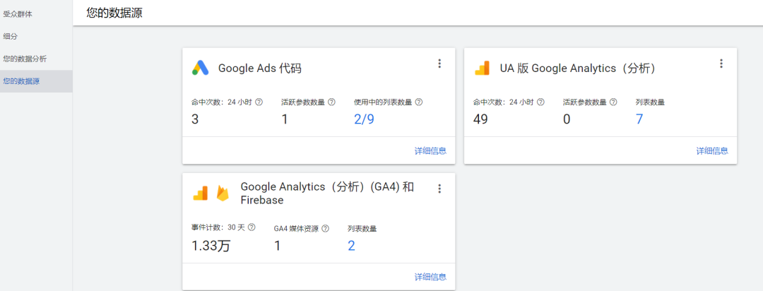 进入“您的数据源”查看是否有“Google Ads代码”这个数据源,如果有的话代表已经安装了代码。