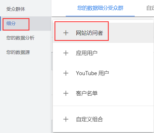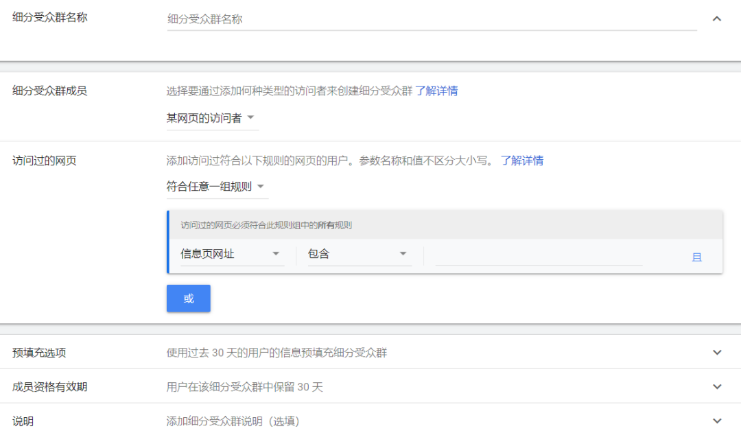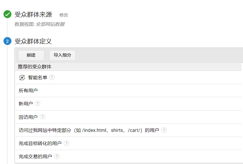 在全局代码安装好后,除了“所有访问者”,还想追踪访问了特定页面的用户,则需要设置细分受众群体。