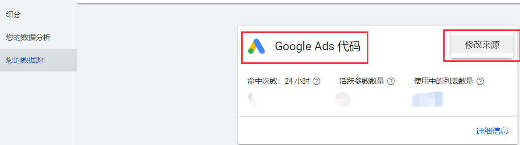 在安装好全局代码后,在“您的数据源”中找到“Google Ads代码”这个 数据源,点击修改