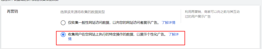 选择第二项“收集用户在您网站上执行的特定操作的数据,以展示个性化广告”