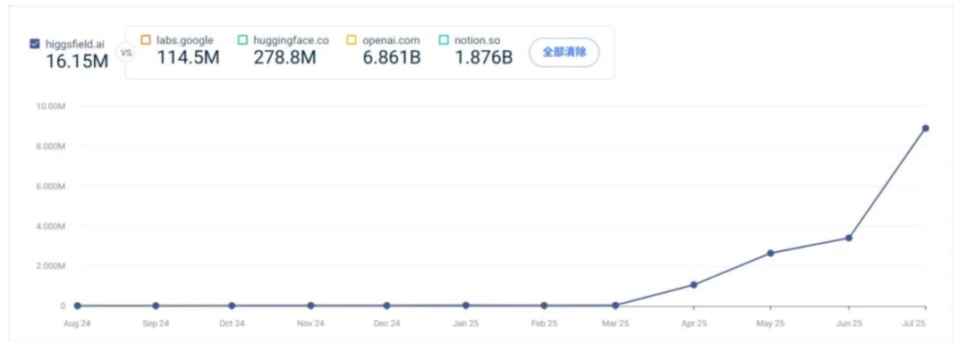就现阶段 AI 图片&视频如此之卷的竞争态势,真的很少有新产品进入视野,Higgsfield 却是个例外。Higgsfield web 端正式上线大概是 2025 年 4 月初,然后便开启了开挂之路,大概以每个月 100w 访问量的速度增长。到了 7 月份更夸张,环比上涨 160%+,来到了 890w,直逼千万访问量。与此同时,其消除的重叠受众来到了 330w+。这一访问量数据,不论放在图片生成、还是视频生成的队伍里,都能排进前十,而它正式上线才不到半年时间。