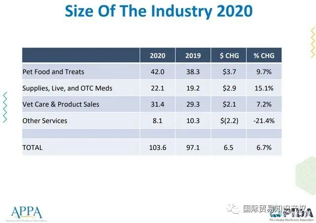 美国宠物用品协会(APPA)发布报告,美国宠物市场零售额历史上首次超过1000亿美元,达到1036亿元的规模,比2019年的971亿美元同比增长6.7%。