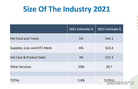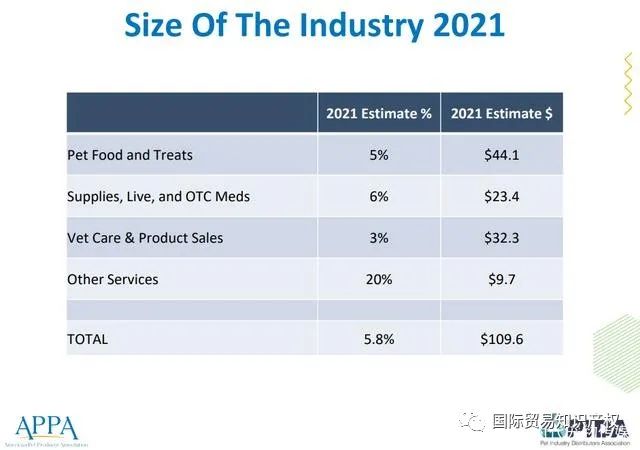 对于2021年的情况,APPA预计,2021年的美国宠物市场的总零售额将达到1096亿美元,所有类别的零售都会增加,整个行业的增长率预计为5.8%。