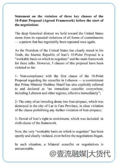 据悉,伊朗伊斯兰议会议长卡利巴夫在当地时间4月8日发表了一则声明,表示伊朗提出的10项停战条款目前已有3项遭到违反。