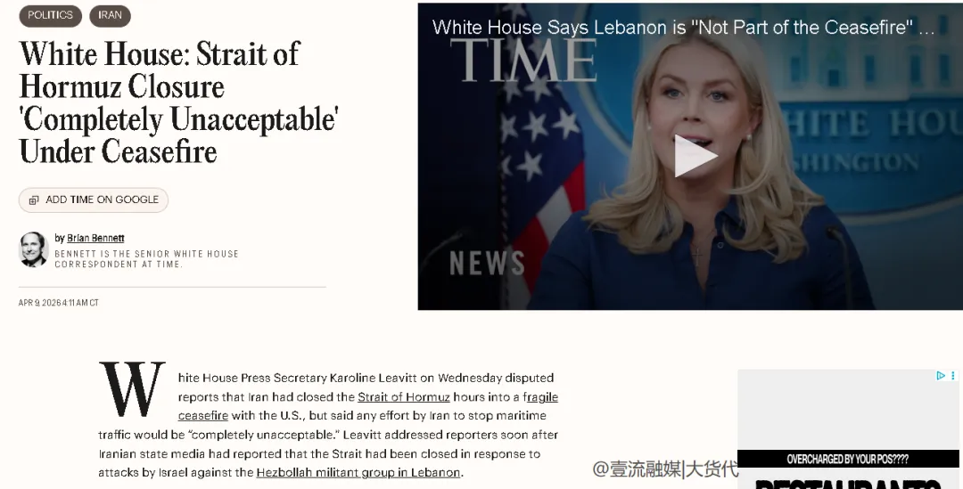 白宫新闻秘书卡罗琳·莱维特先是驳斥了有关伊朗在与美国脆弱的停火协议生效数小时后关闭霍尔木兹海峡的报道,但同时她又表示,伊朗任何阻止海上交通的举动都是“完全不可接受的”。