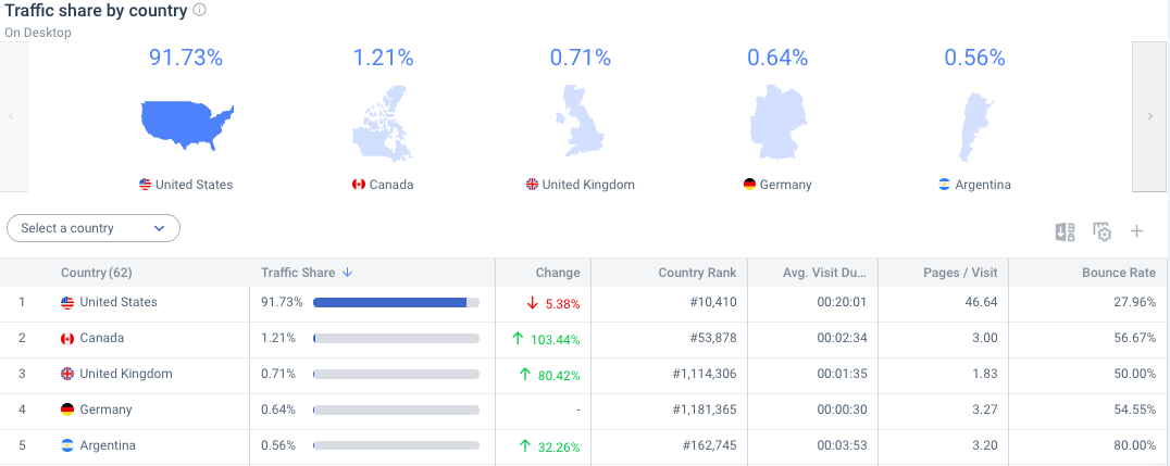 消费者群体大部分分布在美国,占总消费人群的91.73%。基本上是美国市场独大,其他国家流量占比小且质量都不高。