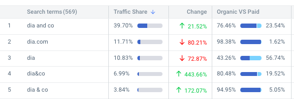 关键词搜索82.1%来自品牌相关词,dia&co完整品牌词的搜索流量大幅度上升,由于网址域名dia,缺失的品牌词dia认知上不足对于搜索有一定影响,可以看出品牌方在不断努力加强完整品牌词的整体认知,已经取得了不错的成绩。