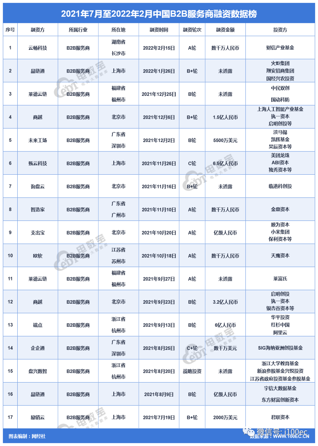 据网经社旗下电商大数据库“电数宝”(DATA.100EC.CN)监测数据显示,2021年7月至2022年2月17日,国内B2B服务商领域共发生了17起投融资事件,融资总额超26.3亿元,涉及的公司包括:云畅科技、晶链通、莱德云链、商越、未来工场、甄云科技、询盘云、智造家、支出宝、欧软、莱德云链、端点、企企通、盘兴数智、励销云等。