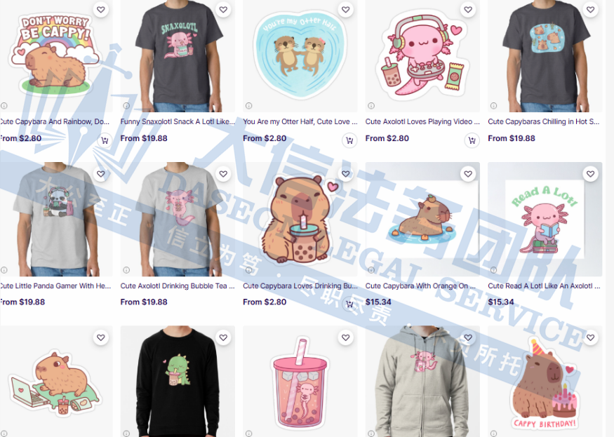 原告是来自新加坡的独立插画师与视觉艺术家,作品以萌趣动物与美食角色为核心,通过圆润流畅的线条、柔和明快的色彩,塑造出圆润可爱的造型与温馨场景。他在 Redbubble 平台上销售自己的原创设计,这些作品被广泛应用在衣服、手机壳、贴纸和家居用品等商品中。